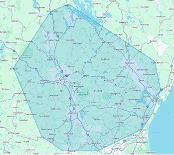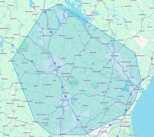 Amherst, Antrim, Auburn, Bedford, Boscawen, Bow, Bradford, Brentwood, Candia, Canterbury, Chester, Chichester, Concord, Deerfield, Derry, Dover, Dunbarton, Epping, Epsom, Francestown, Franklin, Goffstown, Greenfield, Henniker, Hill, Hollis, Hooksett, Hudson, Keene, Londonderry, Loudon, Lyndeborough, Manchester, Mason, Merrimack, Mont Vernon, Nashua, New Boston, Northfield, Nottingham, Pelham, Pembroke, Peterborough, Portsmouth, Raymond, Rochester, Salem, Sharon, Wilton, Windham, Windsor, and several other New Hampshire communities.